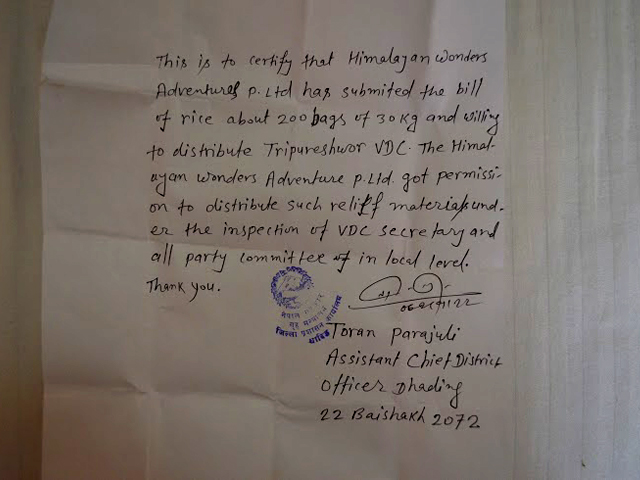 Several of the guides working for Himalayanwonders live in Tripureshwor and I think without their assistance this relief effort would have been much harder to organize. Upon arriving we immediately had the trust of the locals and everyone worked with us to help us distribute things in a fair manner. It would be much more difficult to execute the same operation in other villages without having some type of local trust to build on.