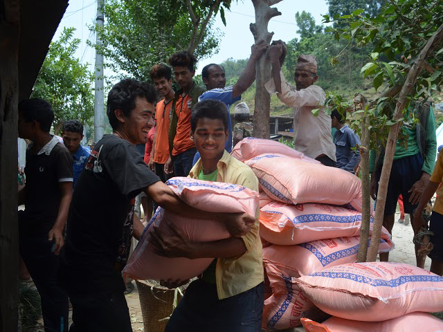 The eight of us representing HimalayanWonders left Kathmandu in a rented Scorpio Mahindra. The road to Dhading is the same as the main road which goes to Pokhara but heads north from Trishuli towards the mountains about 70km from Kathmandu. We continued north on a secondary but still paved road to Dhading Besi where we purchased the rice and paid for the transport. We rented one truck and one tractor with trailer as no other trucks were available. We also obtained permission from the local political office to distribute the rice.