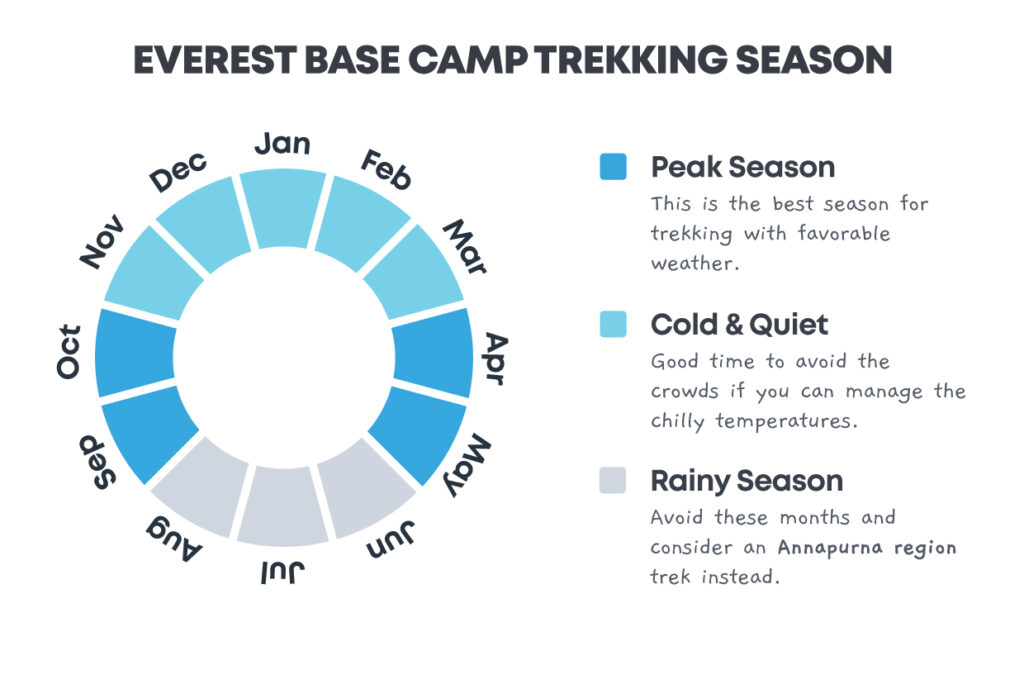 The Everest Base Camp trek is a mecca for adventurous, nature loving souls and hard core granolas alike. It offers pristine vistas for aspiring landscape photographers to capture and is a formidable challenge beckoning to trekkers the world over. If you’re reading this, you’re likely already caught in the allure of Nepal’s most impressive trekking region and are ready to have the question of “When’s the best time to go?” answered. The short answer: The most popular months to go are April, May and October. February, March, November and December are also great months to trek Everest Base Camp. However, the complete answer is more nuanced. Would you like to go with cooler weather and less crowds? Or warmer weather and see the tent city of Everest Base Camp in full swing? Read our comprehensive guide to decide which month is best for you! Please don’t hesitate to reach out if you’d prefer an adventure consultant to help you plan a trek curated especially for your schedule.
